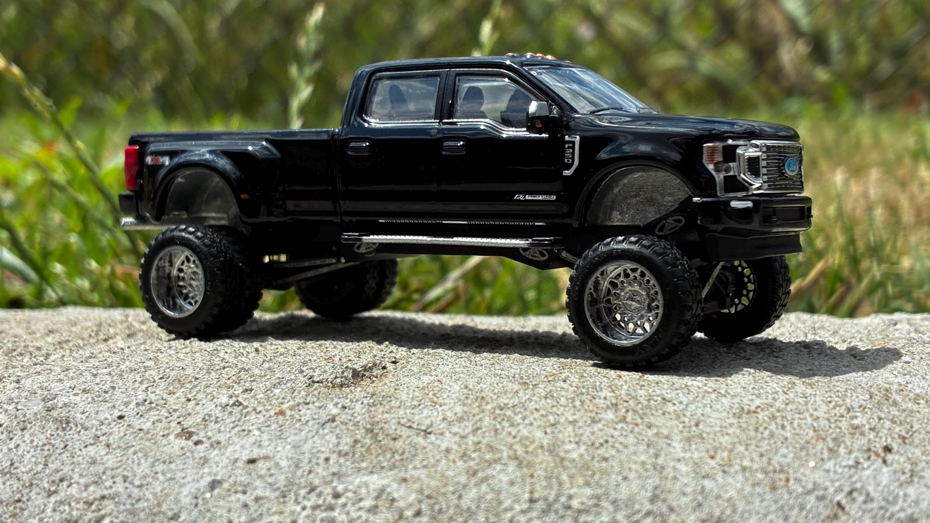 Set of 6 1/64 24" Highly Detailed Dually Wheels and 35" Tires for your custom dually HotWheels, Matchbox, GreenLight, etc. This set comes with traditional dually fronts, super single fronts for the stance guys, and traditional dually rears.